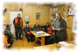 Mettästyksen orkanisaatio oli valittu hirvikokkouksessa ja siihen kuulu jahtipäälikkö, Jussi Pelimanni, varajohtajat Jouko Häckman ja Tapio Rauvala, jahtivouit Matti Pelimanni ja Markku Norman Arpelantien pohjospuolele ja Jouko Häckman ja Markku Sadinmaa Arpelantien eteläpuolele. Koiraporukoitten johosta vastasi Kari Saloniemi. Mettämiehekki marssii vattala, joten ruokapuoli oli annettu "varhmoin kässiin" eli naistoimikunnale. Kämppäisäntänä toimi Kapraalin Nikke, joka orkaniseerasi majalla tapahtuvaa liikehintää. Yllä olevassa kuvassa jahtipäälikkö esittellee päivän akentaa (Kuva: Kari Saloniemi).Käskynjaon jälkheen koothiin porukka yhteispotrethiin. Meitähän oliki aikalaila monta kuten allimmasta isosta kuvasta näkkyy. Kuvasta nyt tietenki puuttuu upean kuvan ottaja elikkä Saloniemen Kari. Koiriakhaan ei kuvassa ole. Net oli pantu authoin sisäle, etteivä riehaannu järjestelheen ommaa orkanisaatiota. Valitettavasti kaikki Vojakkalan Erän mettäveriset hirvenpyyntimiehet ei päässeet matkaan, vaikka olisit haluhneekki, ko oli työhommia. Yhteiset tilaisuuet on Vojakkalan Erässä vetähneet aina väkeä. Noh, toivothaan, että ens kerrala pääsis sitte netki jokka ei nyt päässeet.