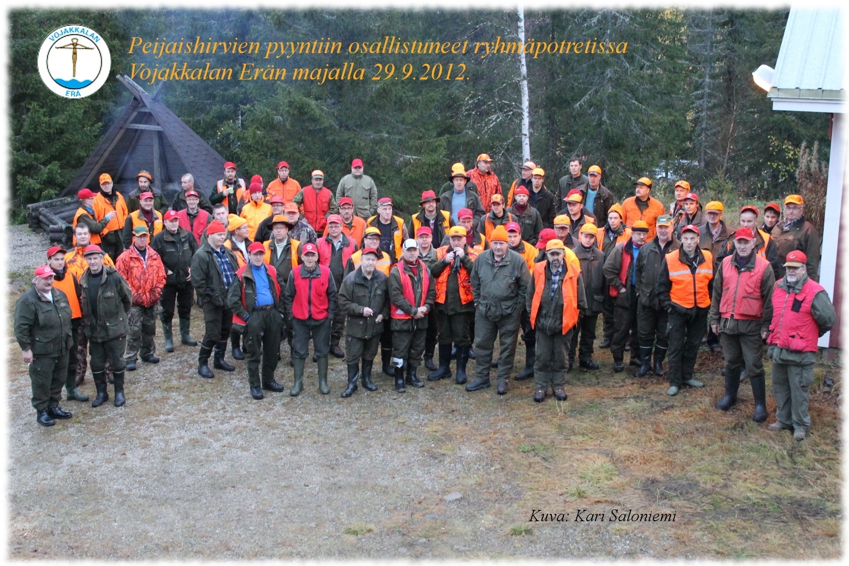 Näin tuumasi Vojakkalan Erän peijaisjahtipäällikkö Jussi Pelimanni ko Vojakkalan Erän peijaistoimikunta lihhaa pathaan pantavaksi kyseli jahtipäivän aamuna 29.9.2012 klo 7:00 Honkamaan majala. Kuttu methään pyythään hirviä peijaispannule kärisehmään oli tullu kaikile mettäverisile hirvimiehile ja naisile, joila pyyntiluvat olit kunnossa. Ja väkeähän aamutuihmaan majala sitte riittiki. Oli ainaski 70 ihmistä ja muutamia koiriaki apuna. Pihassa ja sisälä kävi ilonen puhheen sorina koirien haukkujen säestäessä tapahtummaa. Tunnelma oli lussan puolela ja virtaa oli vielä kinthaissa ko hirvijahtikausi oli vasta alussa.