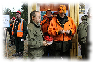 Kuvassa on passipaikkojen arvonta menossa. Jokhainen otti vuorohlaan numerolapun (passipaikan numero) jahtipäälikön lippalakista ja siirty seuraahvaan paikhaan, jossa tarkistethiin luvat ja annethiin viimiset ohjeet passipaikale menosta ja muustaki, jos vielä oli joku asia epäselvä. Oli sattunu ainaski niin viksuja jahtimiehiä paikale, että pyrökratiahommat menit lyhemmässä ajassa ko oli suunniteltu. Passi- ja koiramiehet pääsit jalkhauthuun jo ennen yheksää methään jahtivoutien ja koiraporukan johtajan opastuksela. Kauimmat passimiehet olit Korkeamaassa saakka majalta katottuna ja lähhimmät aivan majan tuntumassa. Päivä oli tosi aurinkonen ja ilma oli kirkas, joten ainakhaan säänpuolesta passissaoleminen ei aiheuttanu mithään onkelmia.