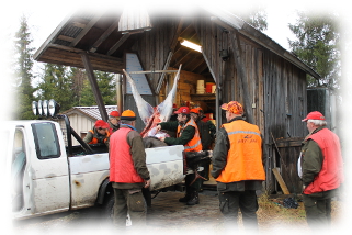Vojakkalan erässä on kiinitetty erityistä huomiota saahliin oikeaoppisseen käsittehlyyn. Oikeala olevassa kuvassa jahtikaverit laittaa lauantaipäivän peijassaalista oottahmaan ammattimiehen leikkuuta riistapesän majan vasithuun vajhaan.